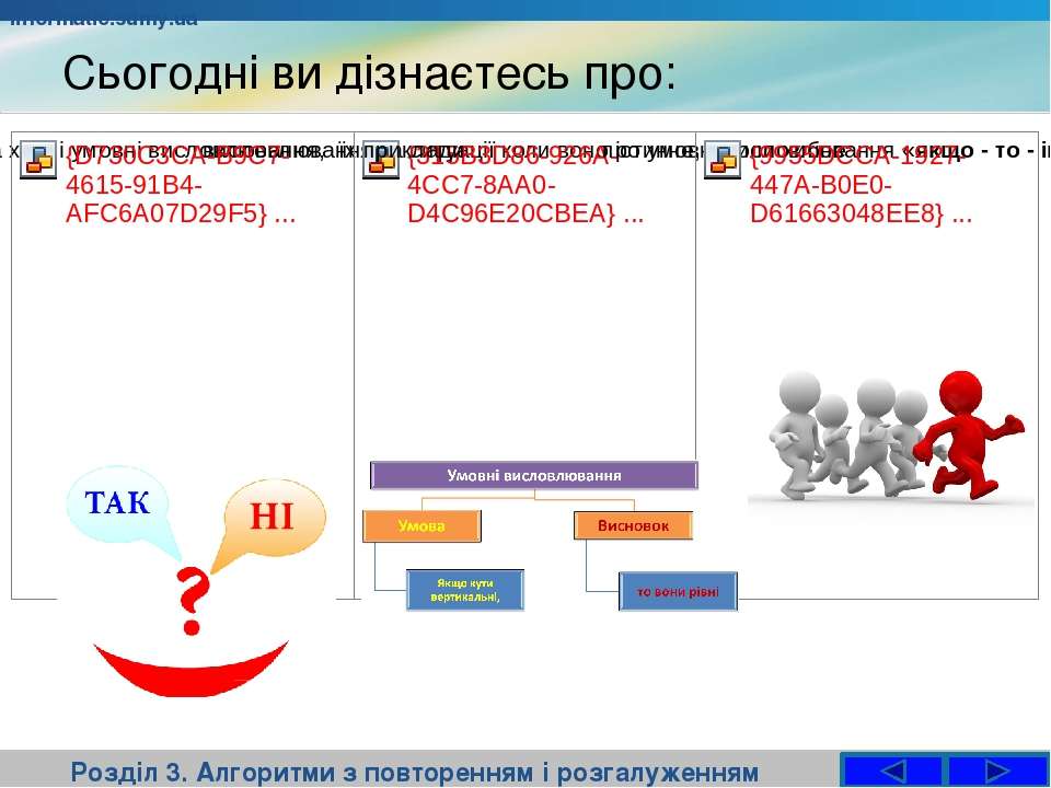 Сьогодні ви дізнаєтесь про: Розділ 3. Алгоритми з повторенням і розгалуженням informatic.sumy.ua
