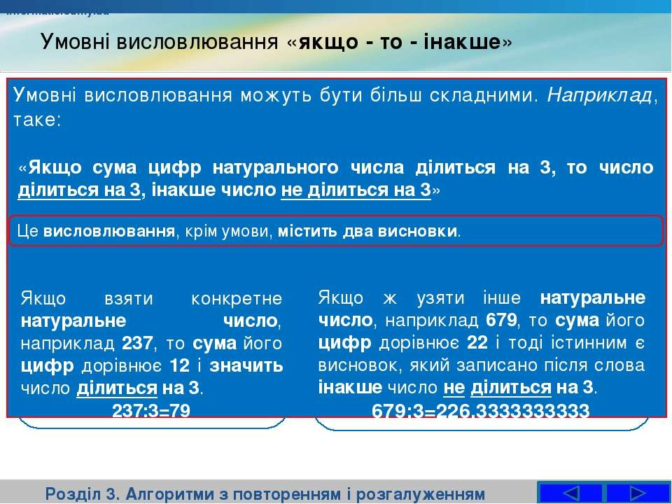 Умовні висловлювання «якщо - то - інакше» Розділ 3. Алгоритми з повторенням і розгалуженням Умовні висловлювання можуть бути більш складними. Наприклад, таке: informatic.sumy.ua «Якщо сума цифр натурального числа ділиться на 3, то число ділиться на 3, інакше число не ділиться на 3» Це висловлювання, крім умови, містить два висновки. Якщо взяти конкретне натуральне число, наприклад 237, то сума його цифр дорівнює 12 і значить число ділиться на 3. 237:3=79 Якщо ж узяти інше натуральне число, наприклад 679, то сума його цифр дорівнює 22 і тоді істинним є висновок, який записано після слова інакше число не ділиться на 3. 679:3=226,3333333333