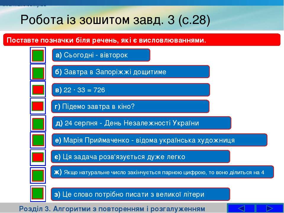 Робота із зошитом завд. 3 (с.28) Розділ 3. Алгоритми з повторенням і розгалуженням informatic.sumy.ua Поставте позначки біля речень, які є висловлюваннями. а) Сьогодні - вівторок б) Завтра в Запоріжжі дощитиме в) 22 ∙ 33 = 726 г) Підемо завтра в кіно? д) 24 серпня - День Незалежності України е) Марія Приймаченко - відома українська художниця є) Ця задача розв'язується дуже легко ж) Якщо натуральне число закінчується парною цифрою, то воно ділиться на 4 з) Це слово потрібно писати з великої літери