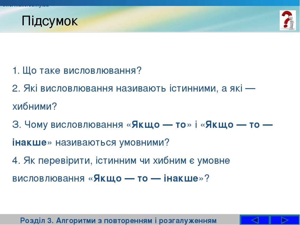 Підсумок Розділ 3. Алгоритми з повторенням і розгалуженням 1. Що таке висловлювання? 2. Які висловлювання називають істинними, а які — хибними? З. Чому висловлювання «Якщо — то» і «Якщо — то — інакше» називаються умовними? 4. Як перевірити, істинним чи хибним є умовне висловлювання «Якщо — то — інакше»? informatic.sumy.ua