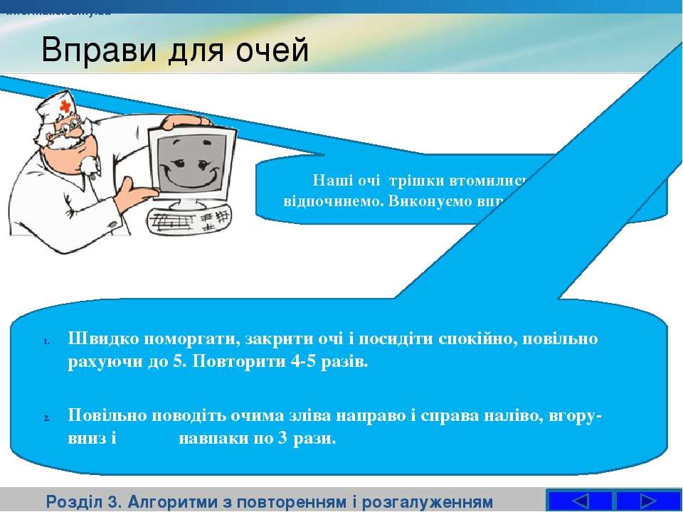 Вправи для очей Розділ 3. Алгоритми з повторенням і розгалуженням informatic.sumy.ua Наші очі трішки втомились і ми зараз відпочинемо. Виконуємо вправи за командою: Швидко поморгати, закрити очі і посидіти спокійно, повільно рахуючи до 5. Повторити 4-5 разів. Повільно поводіть очима зліва направо і справа наліво, вгору-вниз і навпаки по 3 рази.