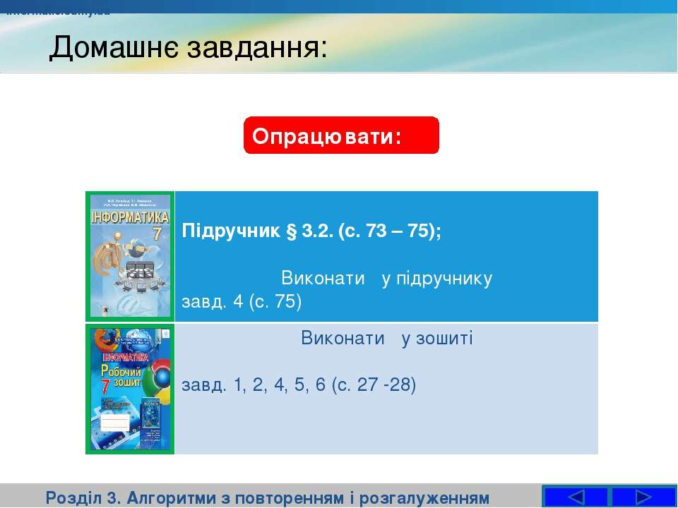 Домашнє завдання: Розділ 3. Алгоритми з повторенням і розгалуженням informatic.sumy.ua Опрацювати: Підручник§ 3.2. (с. 73 – 75); Виконати у підручнику завд. 4 (с. 75) Виконати узошиті завд. 1, 2, 4, 5, 6 (с. 27-28)