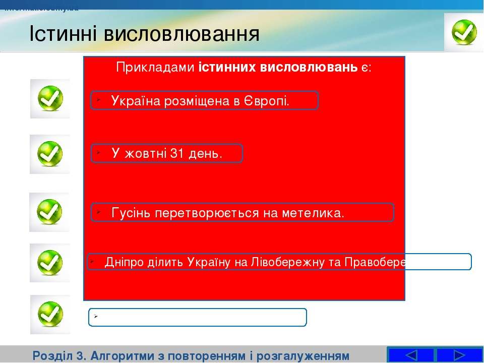 Істинні висловлювання Розділ 3. Алгоритми з повторенням і розгалуженням Прикладами істинних висловлювань є: informatic.sumy.ua Україна розміщена в Європі. У жовтні 31 день. Гусінь перетворюється на метелика. Дніпро ділить Україну на Лівобережну та Правобережну. Художник малює картину.