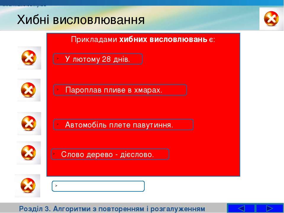 Хибні висловлювання Розділ 3. Алгоритми з повторенням і розгалуженням Прикладами хибних висловлювань є: informatic.sumy.ua У лютому 28 днів. Пароплав пливе в хмарах. Автомобіль плете павутиння. Слово дерево - дієслово. 1 — просте число.