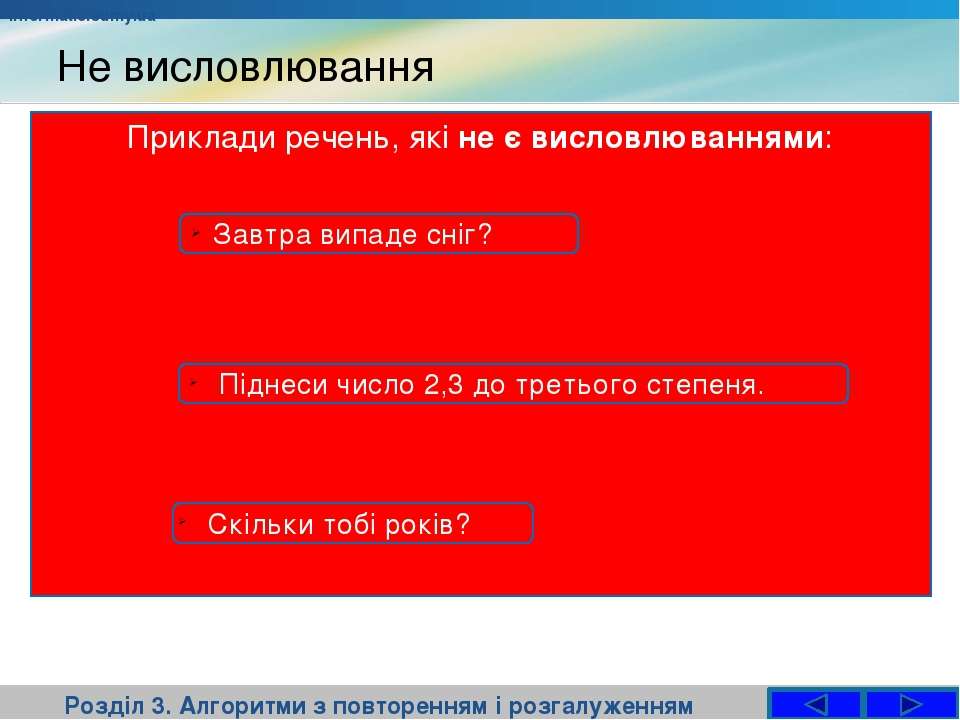 Не висловлювання Розділ 3. Алгоритми з повторенням і розгалуженням Приклади речень, які не є висловлюваннями: informatic.sumy.ua Завтра випаде сніг? Піднеси число 2,3 до третього степеня. Скільки тобі років?