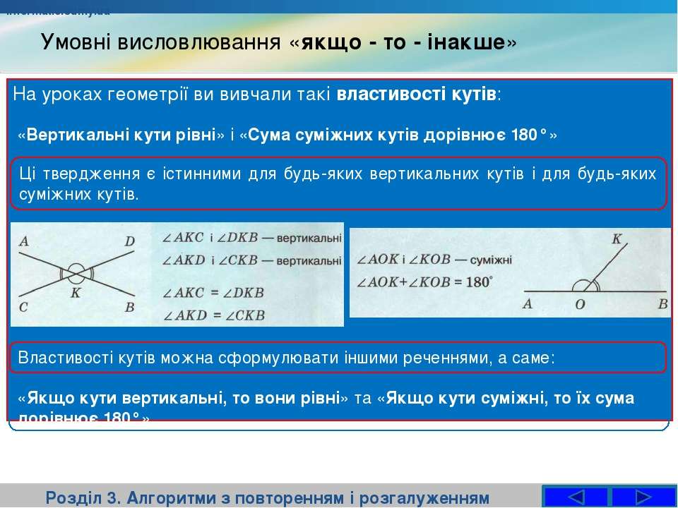Умовні висловлювання «якщо - то - інакше» Розділ 3. Алгоритми з повторенням і розгалуженням На уроках геометрії ви вивчали такі властивості кутів: informatic.sumy.ua «Вертикальні кути рівні» і «Сума суміжних кутів дорівнює 180°» Ці твердження є істинними для будь-яких вертикальних кутів і для будь-яких суміжних кутів. Властивості кутів можна сформулювати іншими реченнями, а саме: «Якщо кути вертикальні, то вони рівні» та «Якщо кути суміжні, то їх сума дорівнює 180°».