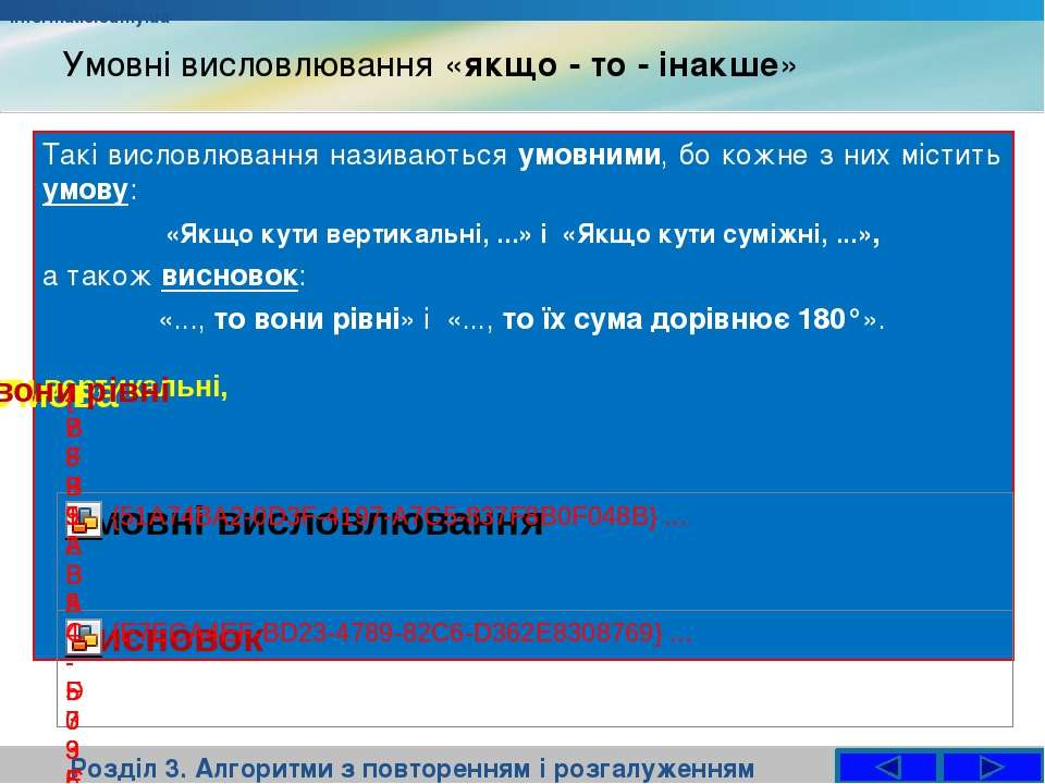 Умовні висловлювання «якщо - то - інакше» Розділ 3. Алгоритми з повторенням і розгалуженням Такі висловлювання називаються умовними, бо кожне з них містить умову: «Якщо кути вертикальні, ...» і «Якщо кути суміжні, ...», а також висновок: «..., то вони рівні» і «..., то їх сума дорівнює 180°». informatic.sumy.ua