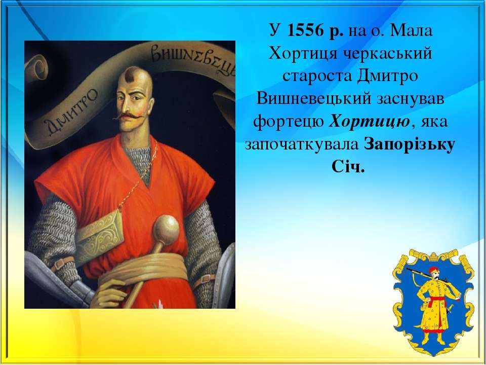У 1556 р. на о. Мала Хортиця черкаський староста Дмитро Вишневецький заснував фортецю Хортицю, яка започаткувала Запорізьку Січ.