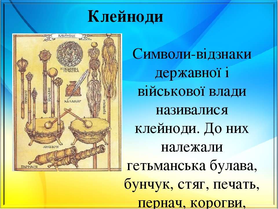 Символи-відзнаки державної і військової влади називалися клейноди. До них належали гетьманська булава, бунчук, стяг, печать, пернач, корогви, литаври, значки, бубни, тростинки й труби. Клейноди