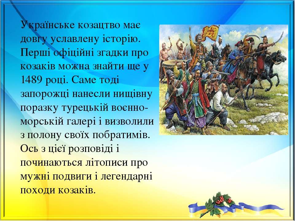 Українське козацтво має довгу уславлену історію. Перші офіційні згадки про козаків можна знайти ще у 1489 році. Саме тоді запорожці нанесли нищівну поразку турецькій воєнно-морській галері і визволили з полону своїх побратимів. Ось з цієї розповіді і починаються літописи про мужні подвиги і легендарні походи козаків.