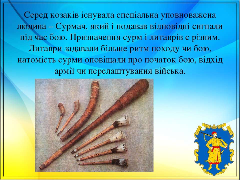 Сурми( труби) Сурми – це старовинний духовий музичний інструмент прямої видовженої форми, який використовували переважно як сигнальний. Сурма — один із видів козацької дерев’яної труби. Козацькі сурми грали до бою.