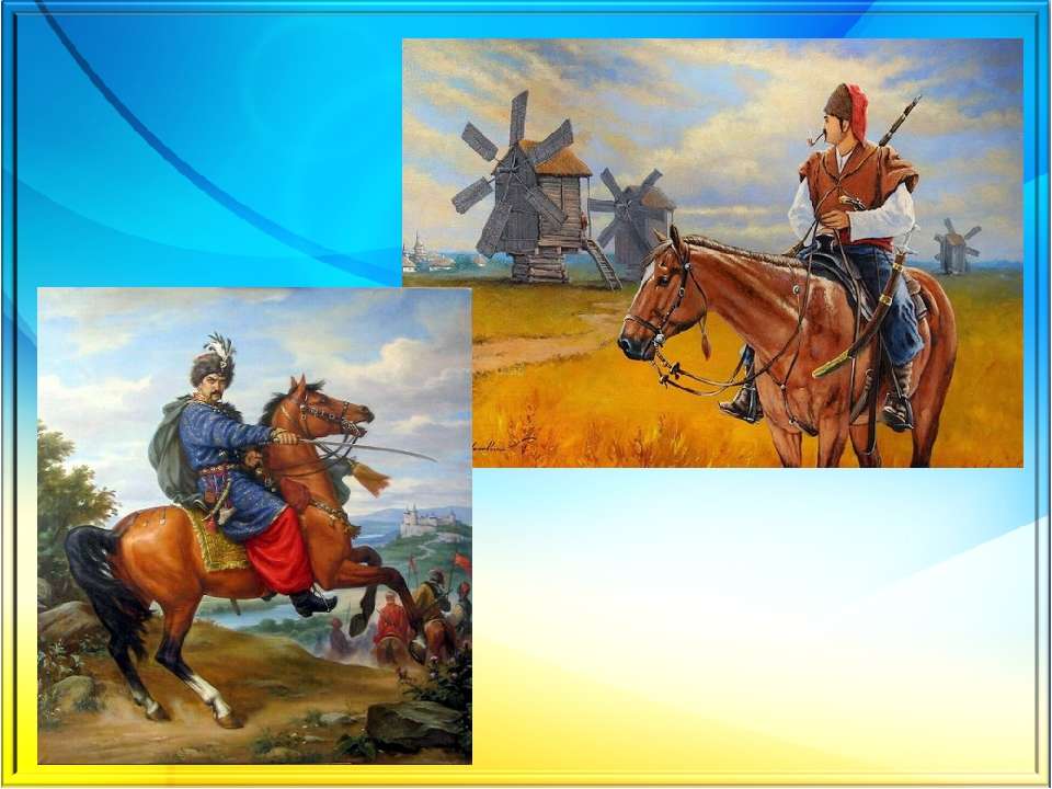 Козацький кінь Без нього неможливо уявити козака ні в мирний, ні у воєнний час. У народних піснях, а отже, і в народних картинах, кінь постає вірним товаришем і побратимом козака. Кінь став уособленням долі, символом воле любності, вірної дружби, відданості, готовності до самопо жертви.