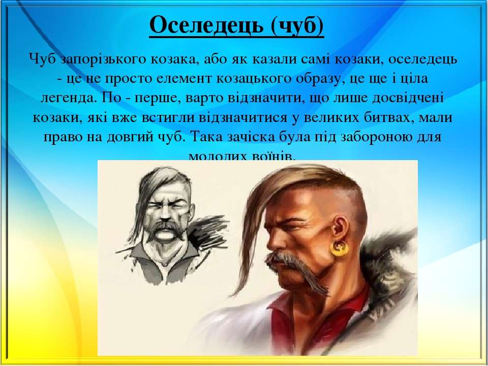 Чуб запорізького козака, або як казали самі козаки, оселедець - це не просто елемент козацького образу, це ще і ціла легенда. По - перше, варто відзначити, що лише досвідчені козаки, які вже встигли відзначитися у великих битвах, мали право на довгий чуб. Така зачіска була під забороною для молодих воїнів. Оселедець (чуб)