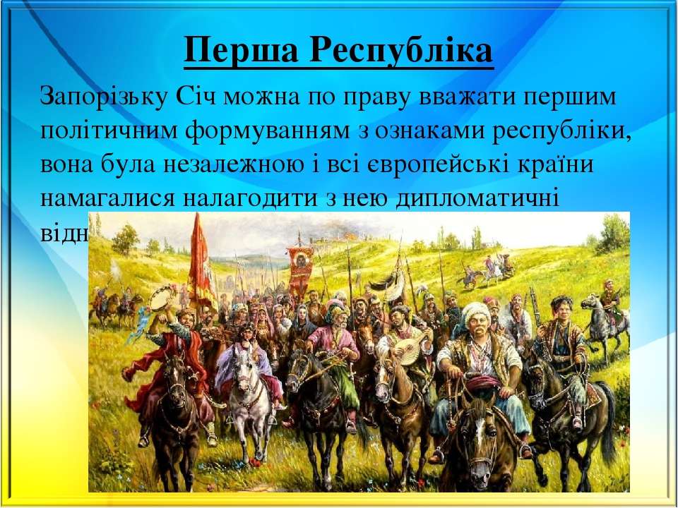 Перша Республіка Запорізьку Січ можна по праву вважати першим політичним формуванням з ознаками республіки, вона була незалежною і всі європейські країни намагалися налагодити з нею дипломатичні відносини.
