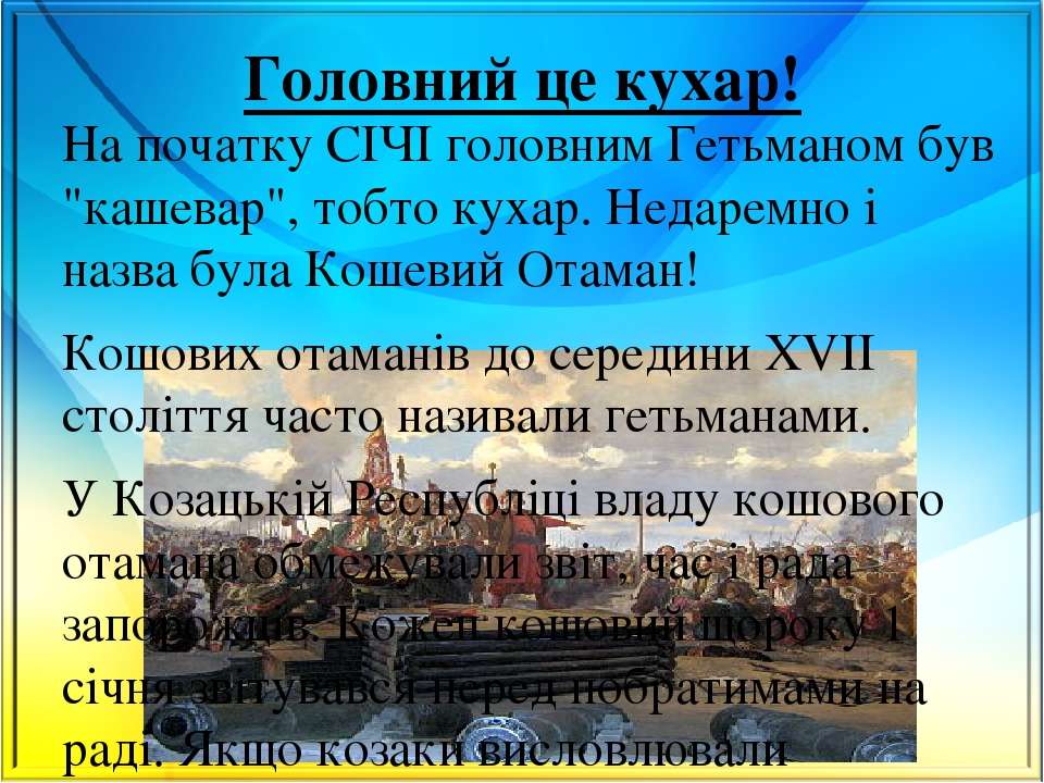 Головний це кухар! На початку СІЧІ головним Гетьманом був "кашевар", тобто кухар. Недаремно і назва була Кошевий Отаман! Кошових отаманів до середини XVII століття часто називали гетьманами. У Козацькій Республіці владу кошового отамана обмежували звіт, час і рада запорожців. Кожен кошовий щороку 1 січня звітувався перед побратимами на раді. Якщо козаки висловлювали невдоволення його діями, отаман негайно кидав на землю шапку, клав палицю, вклонявся товариству, дякуючи за виявлену протягом року честь, і йшов у свій курінь.