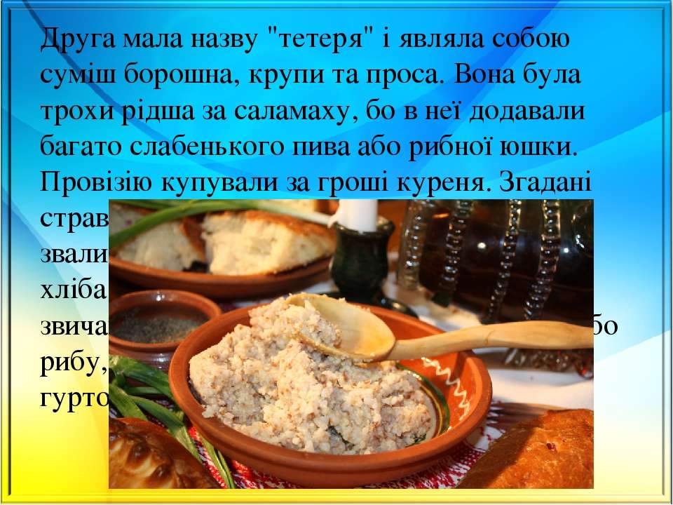 Друга мала назву "тетеря" і являла собою суміш борошна, крупи та проса. Вона була трохи рідша за саламаху, бо в неї додавали багато слабенького пива або рибної юшки. Провізію купували за гроші куреня. Згадані страви подавали у великих посудинах, які звалися "ваганки", але ніколи не вживали хліба. Козаки, які не задовольнялися звичайними стравами, а хотіли їсти м’ясо або рибу, купували їх за власні гроші у складку гуртом.