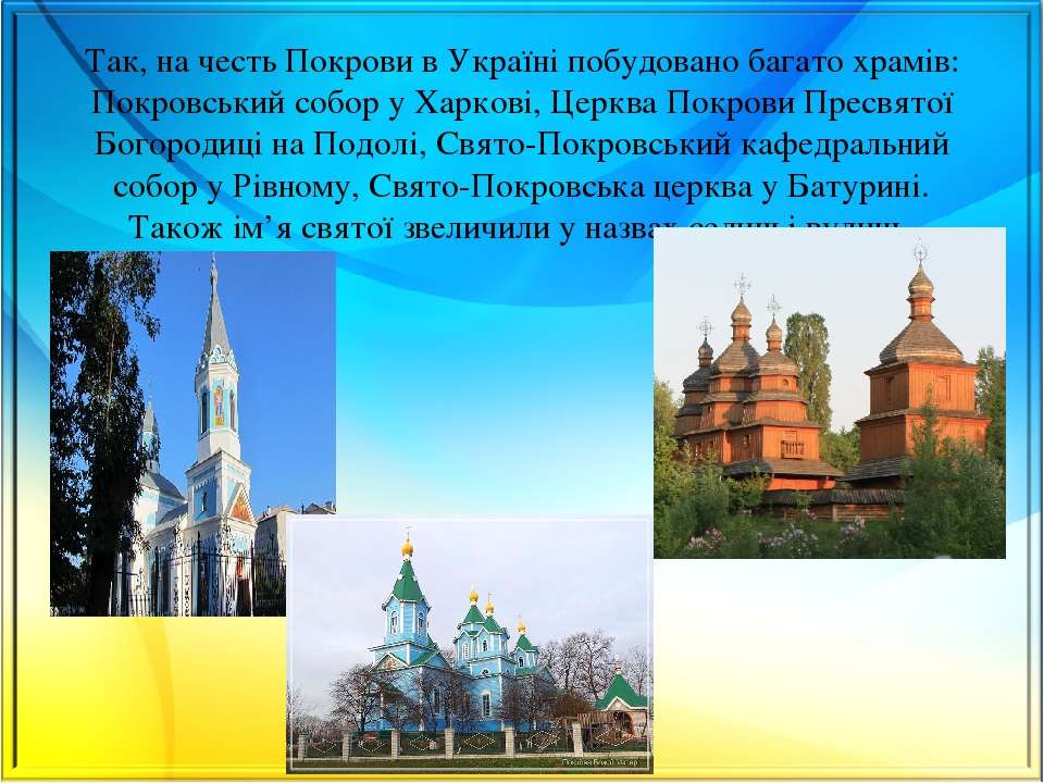 Так, на честь Покрови в Україні побудовано багато храмів: Покровський собор у Харкові, Церква Покрови Пресвятої Богородиці на Подолі, Свято-Покровський кафедральний собор у Рівному, Свято-Покровська церква у Батурині. Також ім’я святої звеличили у назвах селищ і вулиць.